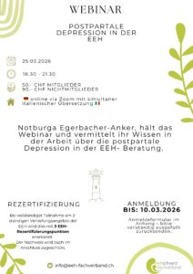 Veranstaltungshinweise Mitgliederversammlung Fachverband EEH Schweiz Mittwoch, 25.03.2026 17.00-18.00 via Zoom Webinar – Vertiefungsangebot Mittwoch, 25.03.2026 18.30-21.30 via Zoom
